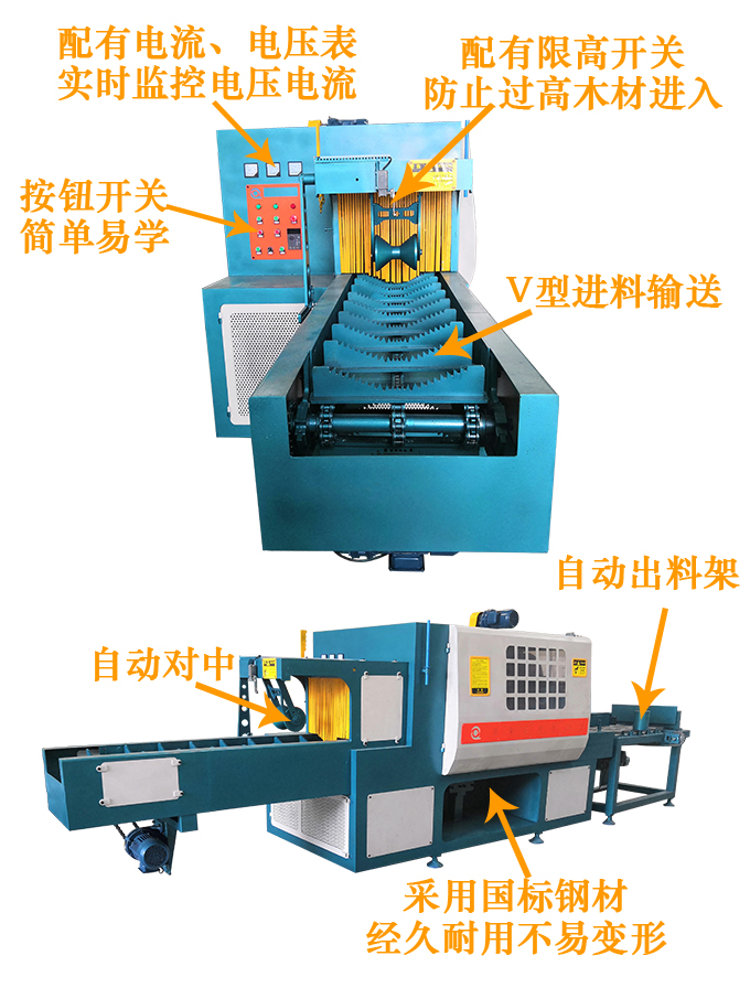 送 料:采用優(yōu)質(zhì)鏈條輸送,機(jī)上配有的變頻智能調(diào)速器,可以對(duì)大小木料的進(jìn)料速度實(shí)行自由調(diào)速。原木可以實(shí)現(xiàn)自動(dòng)分中,機(jī)上還配有限位開(kāi)關(guān),防止超去規(guī)格木料進(jìn)入,防止卡木避免對(duì)機(jī)器造成損壞。