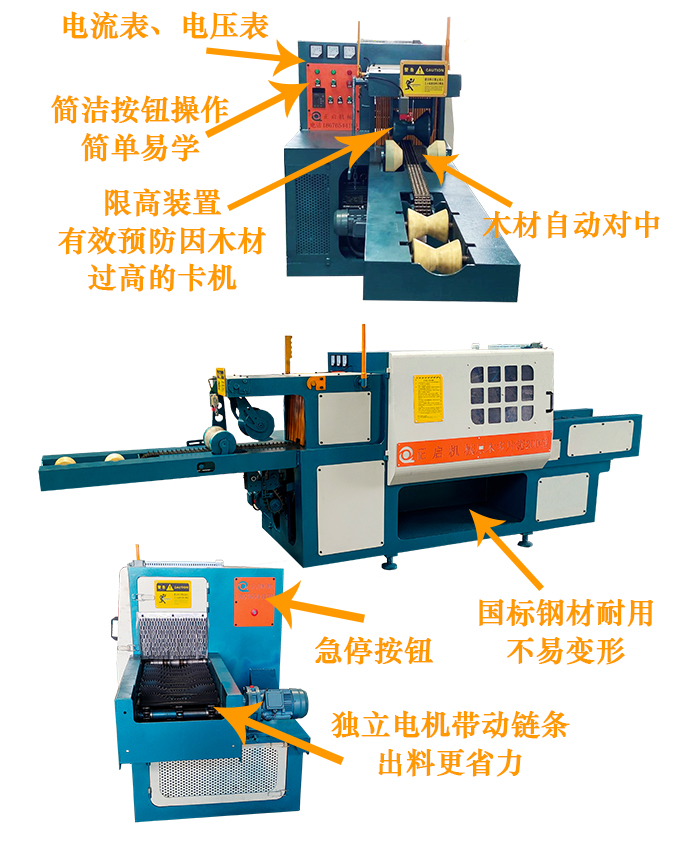 送 料:采用四排尖齒鏈條輸送,機(jī)上配有領(lǐng)先的變頻智能調(diào)速器,可以對(duì)大小木料的進(jìn)料速度實(shí)行自由調(diào)速。原木可以實(shí)現(xiàn)自動(dòng)分中,機(jī)上還配有限位開關(guān),防止超去規(guī)格木料進(jìn)入,防止卡木避免對(duì)機(jī)器造成損壞。