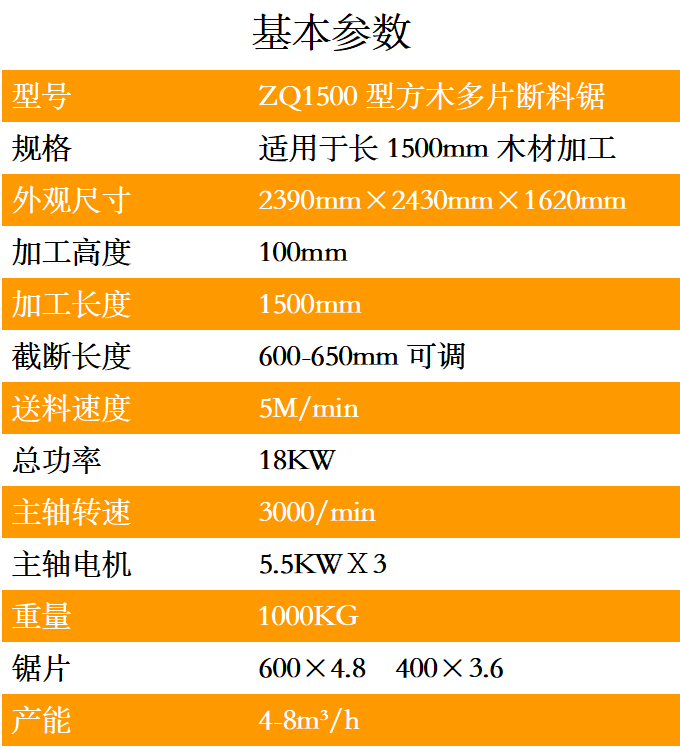 方木多片斷料鋸可加工木材長度1500mm,高100mm,截斷尺寸600mm-650mm之間可調,送料速度5M/min,機身采用國標鋼材、結構緊湊、操作簡單、鋸面光滑、誤差小、效率高、故障率低。